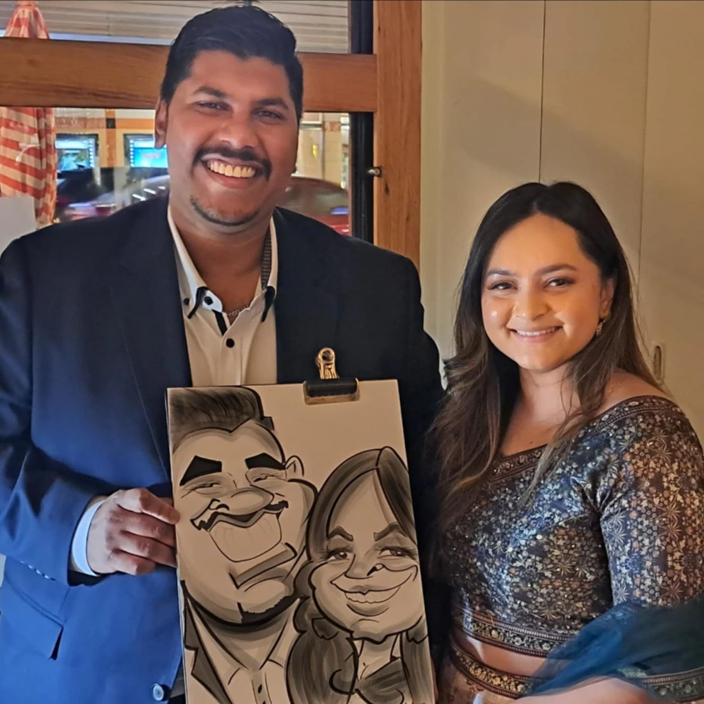 A live wedding caricature artist draws fun, exaggerated portraits of your guests on the spot at your wedding reception — giving everyone a personalised keepsake to take home and enjoy.